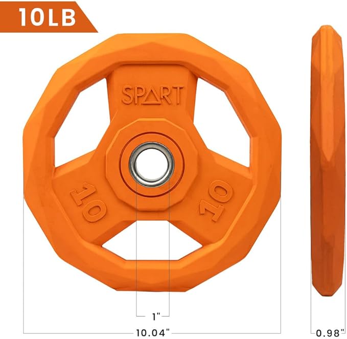- 💪FEATURE: SPART weight plates have a solid iron core and slide rubber surface. This design can protect the floor from damage and ensure enough weight when you do exercise. The strong steel ring insert can help you assembly the barbell easily. The three holes are designed for grip according to your hands and you can do weightlifting exercise with single plate as well.Also,each size has a unique color that you can easily identify.