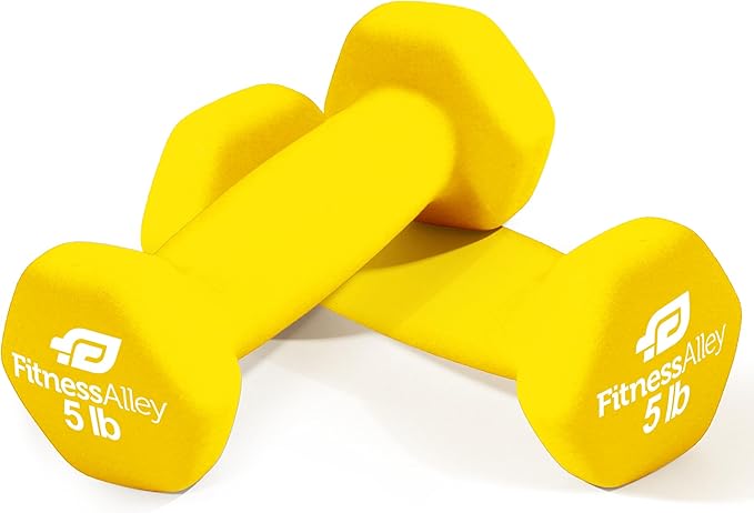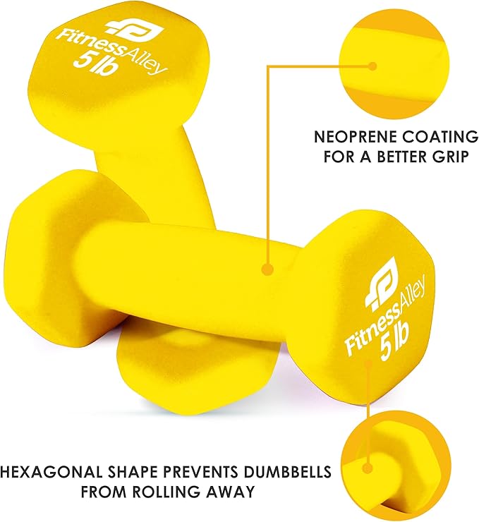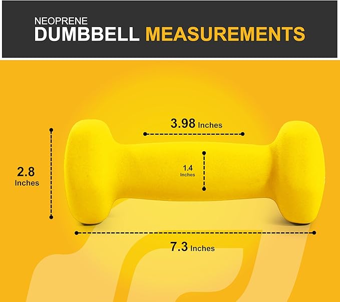 - The box includes 2 Dumbbells that comes in 5LB Size and yellow Color. Construction is of cast iron, which is of superior quality along with neoprene gripping that allows lifting of heavyweights simpler and easier