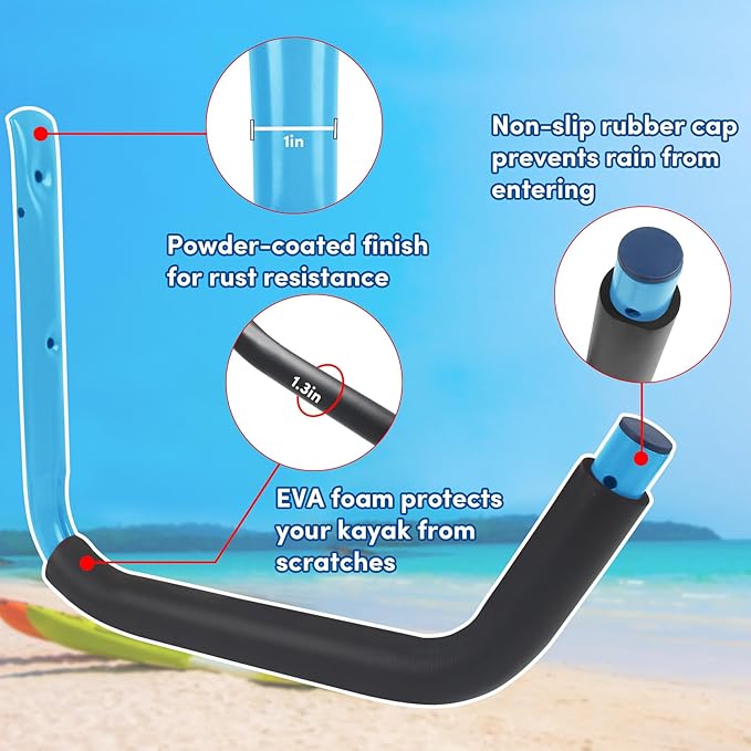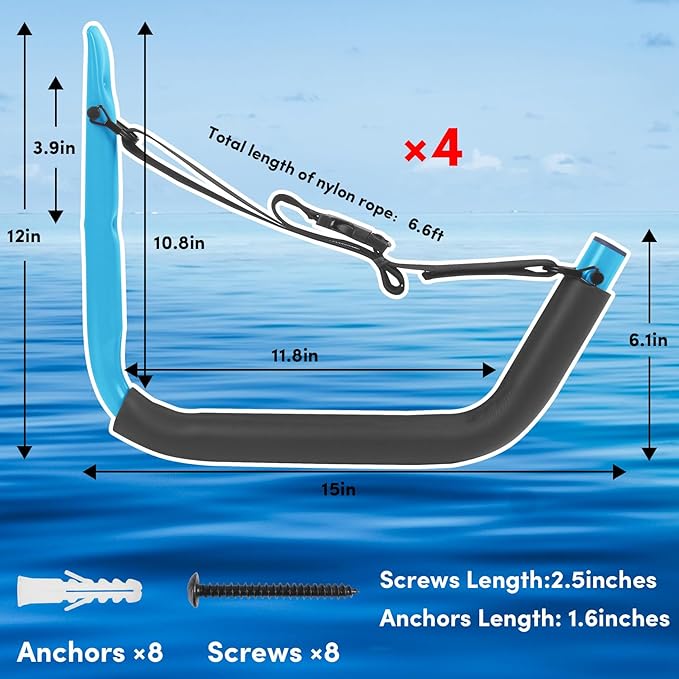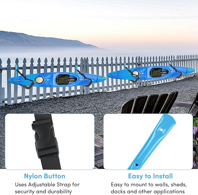 - 【Safe and Reliable】 Each kayak wall rack has a 5mm thick EVA foam protective pad to protect your kayak or stand-up paddle boards from damage due to storage. The 6.6 ft nylon strap and clip included with the garage kayak mount ensure that your kayak is securely secured in place and not easily detached. The sharp edges of the kayak storage rack are covered with rubber, hiding the sharp parts to make it safer and prevent rainwater from entering.