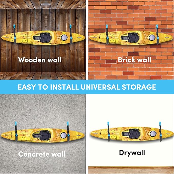 - 【Versatile Storage Options】Kayak storage racks for garage can be used to hang kayak, canoe, SUP, snowboard, skateboard, surfing board.And kayak storage brackets can also be used to store other bulky items such as folding chairs, ladders, bikes, tools, garden hoses, lumber and other bulky items,which is practical and convenient.kayak wall mount with strap can be used to store items indoors and outdoors.