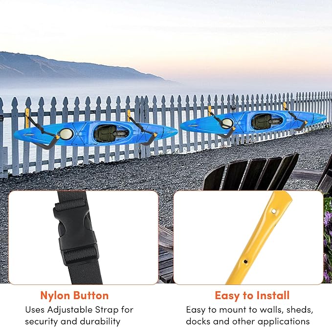 - 【Safe and Reliable】 Each kayak wall rack has a 5mm thick EVA foam protective pad to protect your kayak or stand-up paddle boards from damage due to storage. The 6.6 ft nylon strap and clip included with the garage kayak mount ensure that your kayak is securely secured in place and not easily detached. The sharp edges of the kayak storage rack are covered with rubber, hiding the sharp parts to make it safer and prevent rainwater from entering.