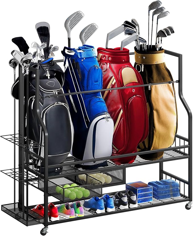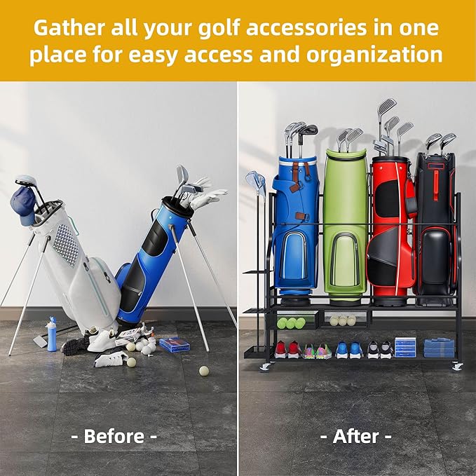 - Room for All Your Gear: Easily store up to 4 golf bags, 24 clubs, and more accessories in one convenient rack. Includes 2 drawers for secure storage of balls, brushes, and other essentials, keeping everything within arm's reach