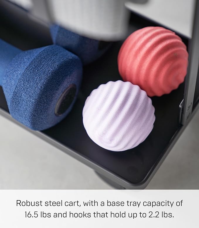 - [Fitness goods storage] If you like stretching and exercising at home, this slim rolling cart is a must to keep everything organized, with areas for dumbbells, yoga mats, foam rollers, towels, and much more.