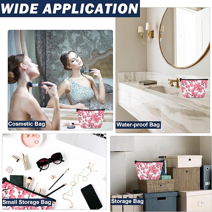 Cherry Blossom Makeup Bag for Purse, Waterproof Funny Japanese Pink Sakura Cosmetic Bag for Women, Zipper Travel Pouch Gift 9.5×5.9 Inch