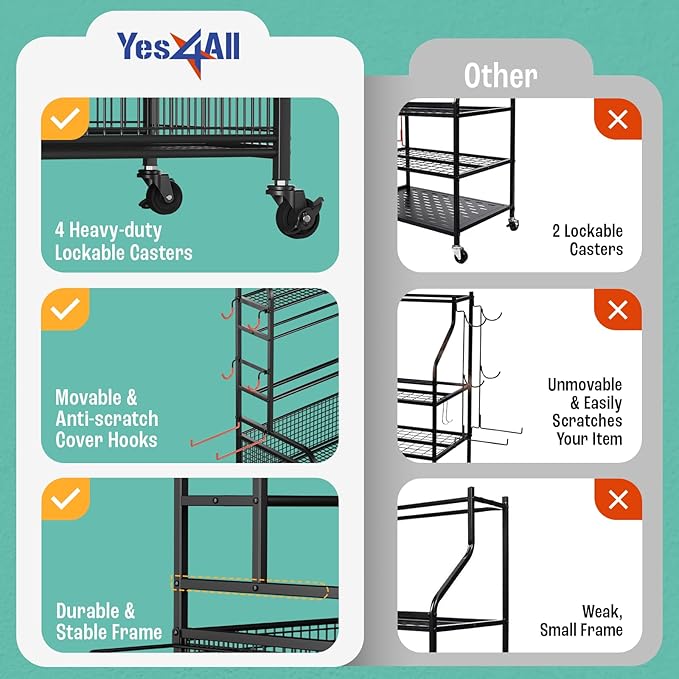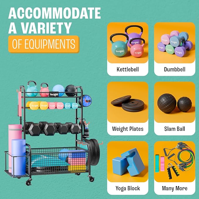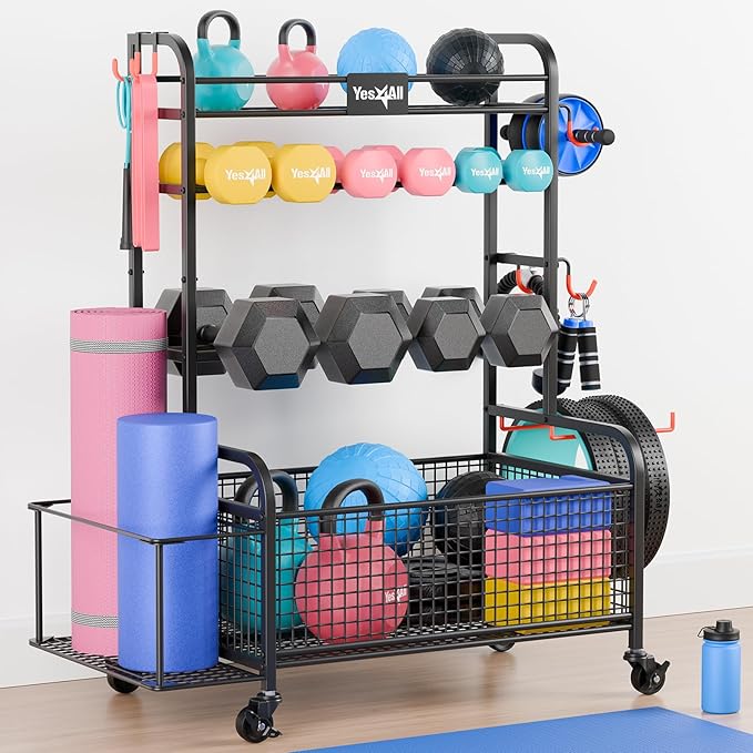 Yes4All Dumbbell Rack, Weight Rack for Home Gym, Sports Equipment Organizer for Dumbbells Kettlebells Yoga Mat Foam Roller and Balls, All in One Gym Workout Storage with Wheels and Hooks