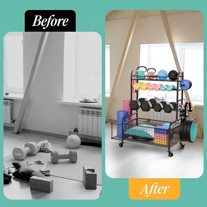 - Versatile Practice Design: Our exercise equipment storage organizer features 3 layers of dumbbells storage, a dedicated side basket for yoga mats and foam rollers, and multiple side hangers for resistance bands and roller wheels; The spacious bottom rack is ideal for storing many balls, yoga blocks, and other exercise essentials