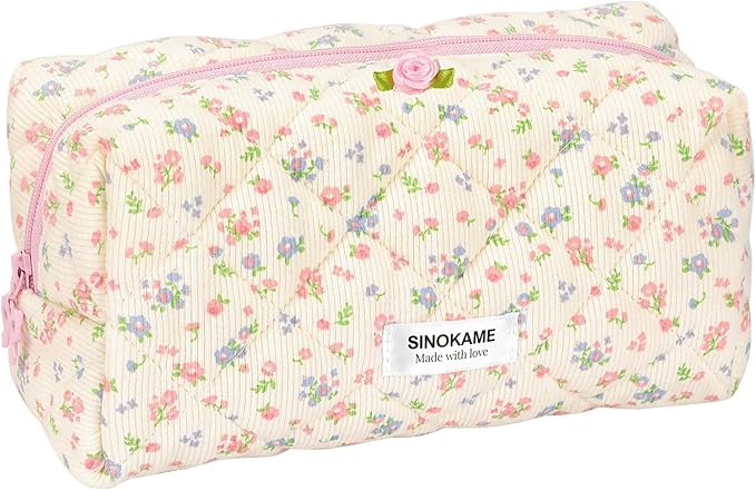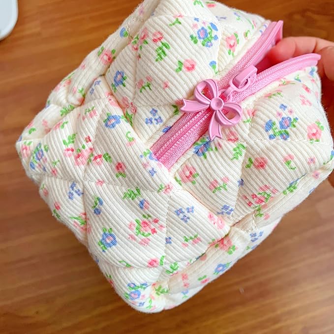 - CUTE AND SPACIOUS: These cute cotton quilted makeup bags in pink floral patterns add a girly touch to your day, complemented by a soft, clean aesthetic. Measuring 8.3'' x 3.9'' x 3.9'' / 21x10x10cm, they offer ample space for essentials like makeup, skincare, and more, fitting perfectly in your big tote backpack