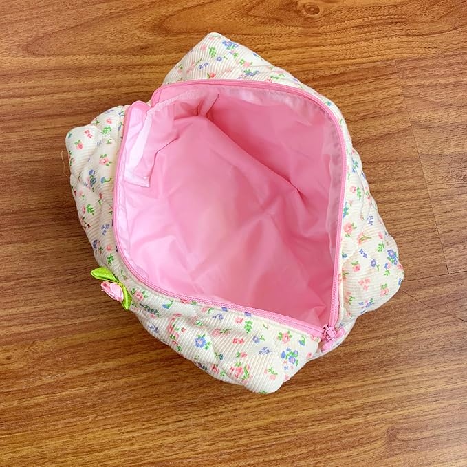 Quilted Coquette Travel Makeup Bag, Large Capacity Puffy Cotton Cosmetic Bag Toiletry Organizer for Women Reusable Washable Aesthetic Floral Pouches Handmade,Floralwhisper