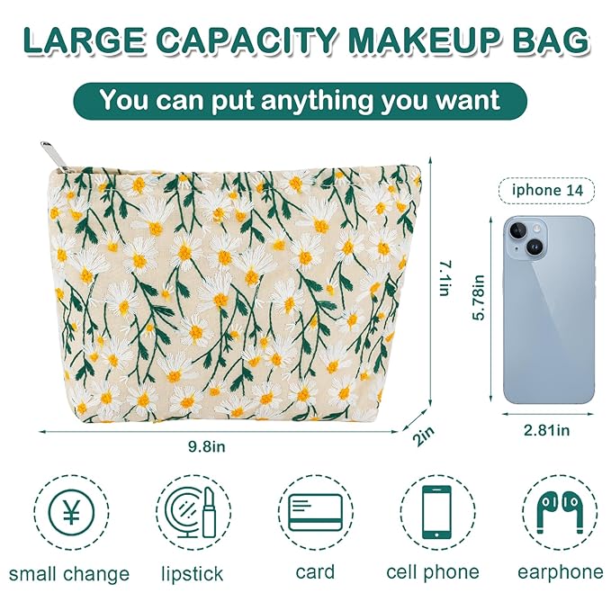 - Spacious Toiletry Bag: Our flower makeup bag measures 9.8×7.1×2 inches, easy to carry. This floral cosmetic bag can hold small items such as makeup, skincare products, lipstick, eye shadow, eyebrow brush, etc. The makeup organizer bag has a large capacity and folds up conveniently when not in use