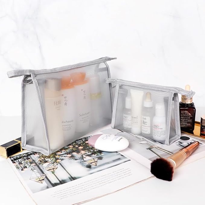 fashion portable cosmetic bag,Visible large capacity Nylon storage bag, for Business Travel bath, Unisex (gray 3pcs set) (gray whole mesh triangle zippered cosmetic bag)