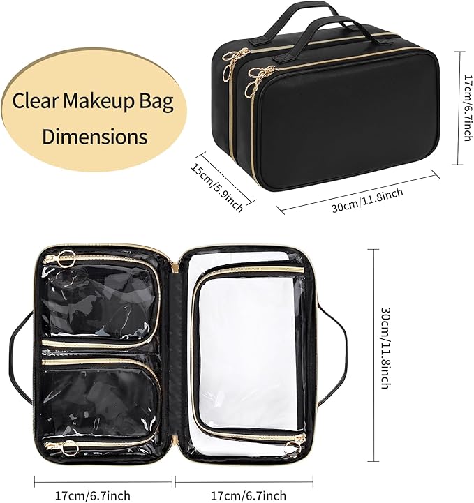 - 【Large Capacity 】Cosmetic Bag size:11.8“x5.9“x6.7“. both part with double zipper design,can holds a lot of makeup products.Easy storage and orderly.Have enough space to storage your Cosmetics, Skin Care Products, Toiletry Accessories such as lipstick, makeup brushes,eyeshadow palette, eyeliner, powder, liquid foundation