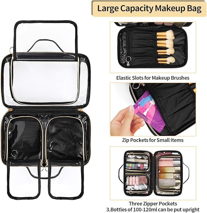 OCHEAL Travel Toiletry Bag, Double Layer Clear Makeup Bag Organizer Large Capacity Cosmetic Bag for Traveling Women Beauty Essentials, Multiple Compartments Makeup Case- Black