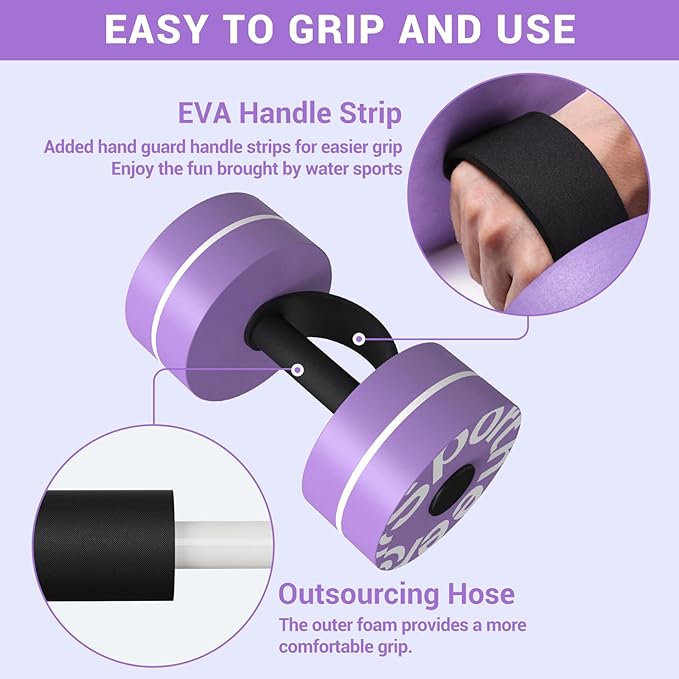- Ergonomic & Comfortable Grip: Designed with user comfort in mind, each aerobics water dumbbell features a solid PC handle covered in soft foam and double grip strips, ensuring a secure and comfortable hold during all swimming or pool workouts