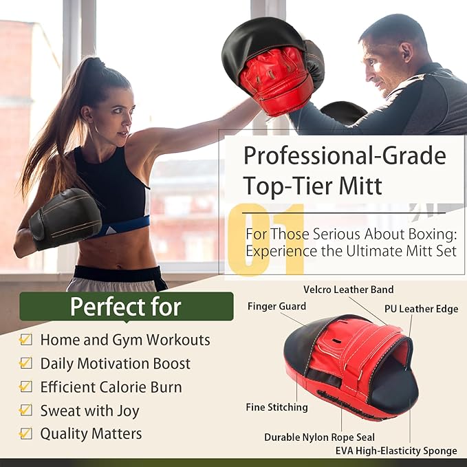 - 【SUPERVISED BY FORMER BOXER】- We have meticulously crafted a set of gloves and mitts, perfect for both home practice and gym rentals. Our professional-grade gear enhances your punch precision, whether you're training in boxing, Muay Thai, karate, kickboxing, taekwondo, or mixed martial arts. Upgrade your skills with our expertly selected equipment.