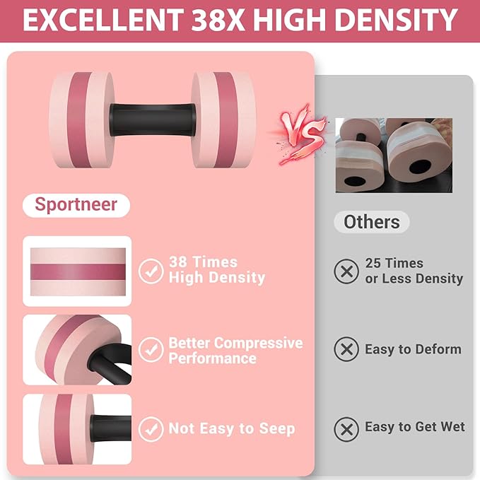 - 38 Times High-Density Material: Compared with other water dumbbells on the market, the Sportneer water weight made of high-quality, 38 times high-density EVA foam materials are durable, safe, environmentally friendly, waterproof, odorless, and quick-drying