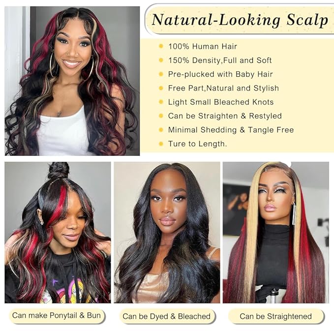- 【Skunk Stripe Body Wave Wig Human Hair Material】: Black red blonde body wave wig human hair crafted from 100% high-grade human hair, this wig offers a natural, lustrous appearance that is soft to the touch and easy to manage.