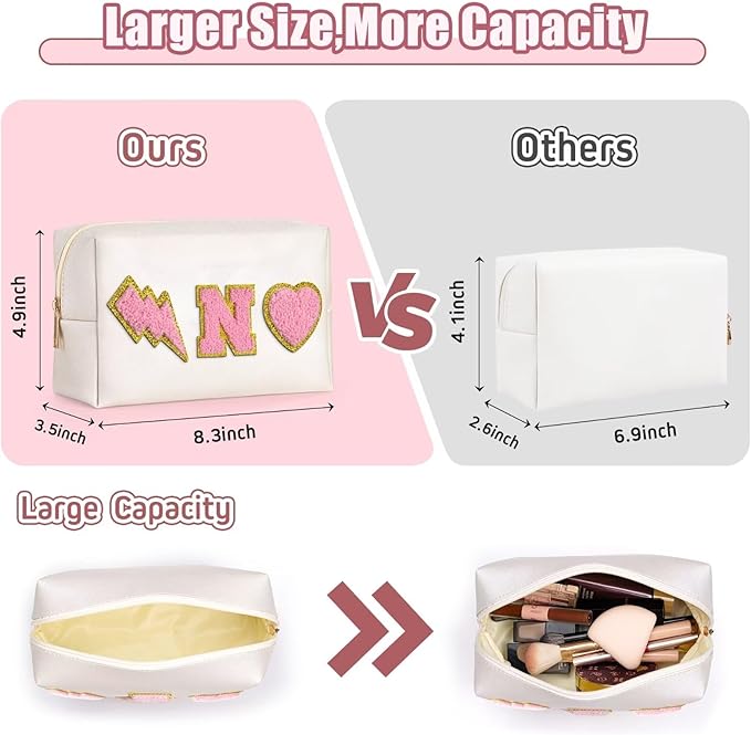 - 【Large Capacity】 Upgrade large letter makeup bag is spacious, the size of the toiletry bag is approx. 8.3x 5.1x 3.5 inch, roomy interior organization enough to hold your everyday beauty essentials for taking on trips, sleepover, or touching up throughout the day. A good helper for you organizing cosmetics and preventing loss.
