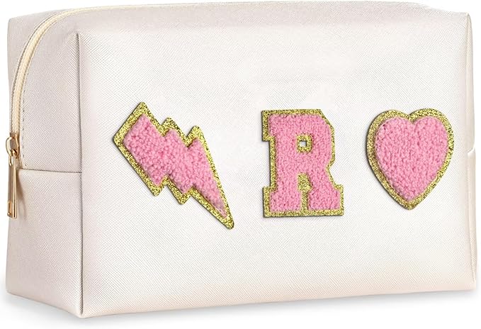 - 【Exquisite Design】 White make up bag decorated with chenille patches--letter, lightning and heart, stitched not glued, sturdy not easy falling off. These trendy and lovely elements are made from towel embroidery, and come with a gold glitter edge, no redundant threads, which is chic and delicate, adding a pretty feeling to your bag.