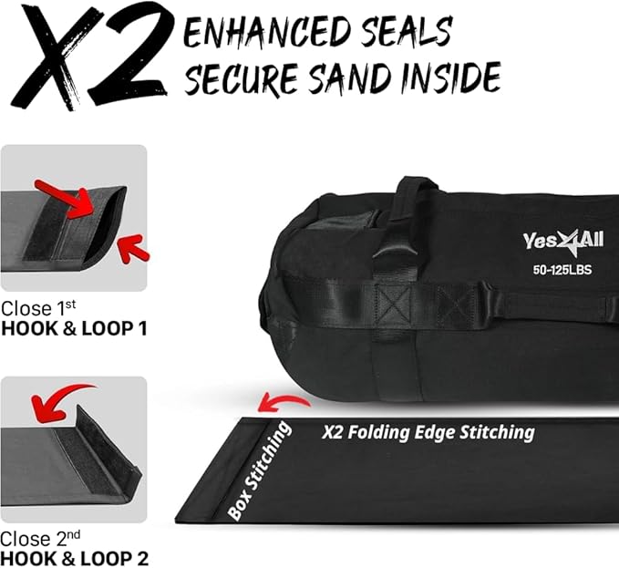 - ππππππ & ππππππ-π πππ: Our sandbags feature upgrades including 'Box stitching & double-enclosure Velcro' and 'Double fold edge with dual stitching' for enhanced sand leakage resistance. Carry high or toss far, your sand stays securely in place!