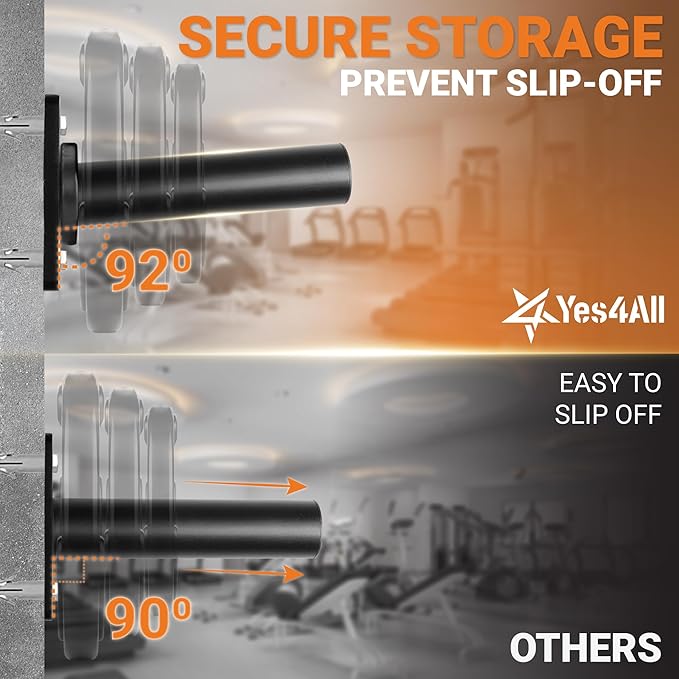 - PREVENT SLIP OFF: The weight plate holder is designed with a slight curve upwards as a locking mechanism to prevent weight plates from sliding off; The protective rubber pads reduce scratches and keep your workout area clean