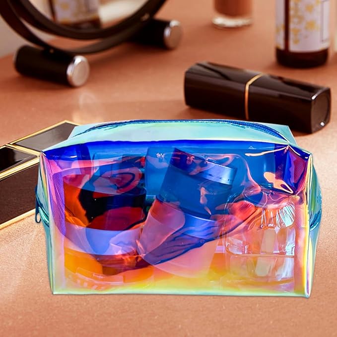- PERFECT GIFT:translucent, glossy, and holographic design makes the makeup bags shiny, sparkly and super cute.These are cute for toiletries. In different light you may see more yellow while pink/purple appear as well. This clear cosmetic bag is a perfect gift for your friends, family and loved ones.