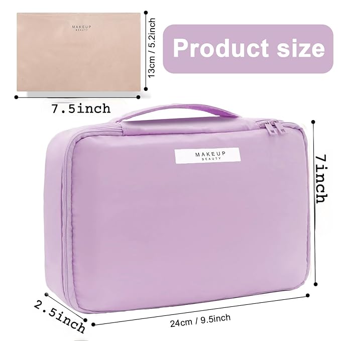 - 【Large Capacity 】Cosmetic Bag main size:9.5*2.5*7(in),weight:4.39(oz),material:Nylon .The small bag inside size:7.5*5.2(in) .This makeup bag is not a rigid type, the soft fabric can hold more products.3 separate compartments,double zipper design.Easy storage and orderly