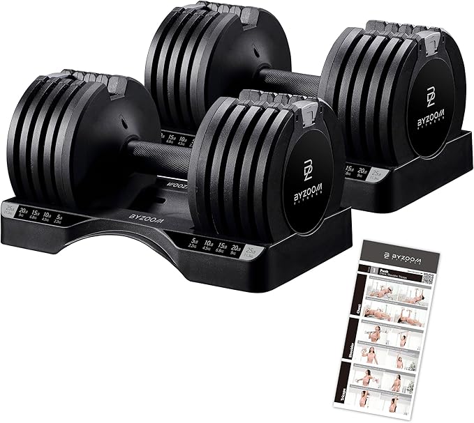 - CONVENIENT AND SPACE SAVING: Fixed length on adjustable dumbbells is never a problem for BYZOOM FITNESS. The exclusive patented weight selection mechanism allows you to have an accurate weight and adjustable length.