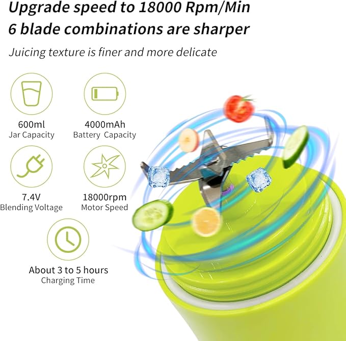 - 【High Speed & Larger Capacity Blender】Our portable blender adopts 270W powerful motor allows your single blender for shakes and smoothies. Low working noise, 20oz (600ml) large-capacity personal blender allows you to make as many delicious drinks as possible at one time. A one-button action, 6 stainless blade which can easily and quickly crush ice cubes, mash vegetables and fruits to make delicious drinks only 30 seconds.