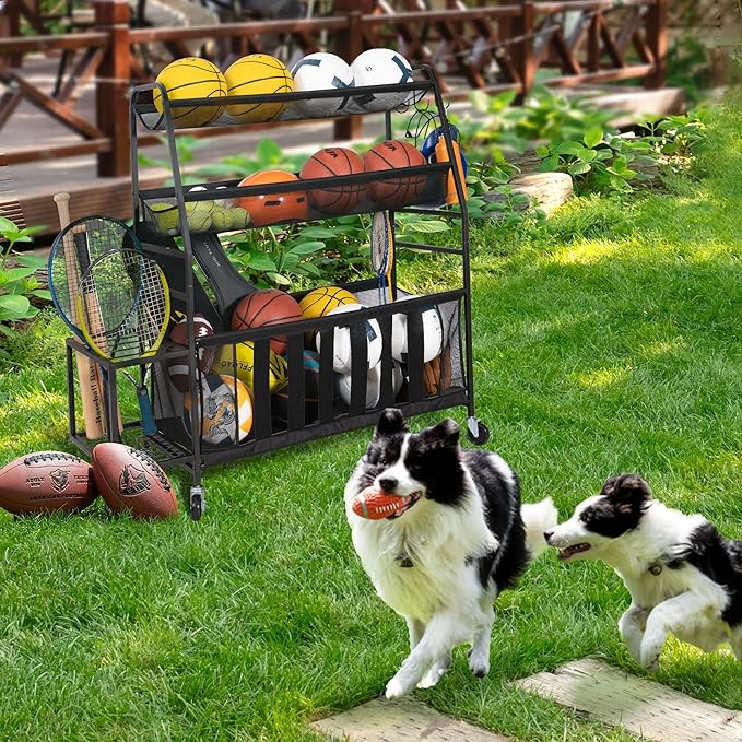 - 【DURABLE CONSTRUCTION】: This 3-Tier sports rack organizer is made of high quality black powder coating steel, rust resistant and durable, with one large storage bin and two PVC shelf baskets. This sports equipment storage rack will be a life-long use, as an indispensable role for garage ball organizer.