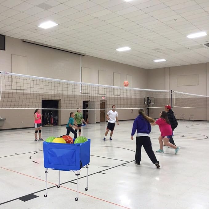 - capable of accommodating up to 26 volleyball balls and supporting a maximum weight of 65 pounds. This sports organizer is versatile, suitable for volleyball, basketball, soccer, football balls, while also providing storage for various items such as toys, rackets, skateboards, and other sports equipment, or even pool supplies. Additionally, the ball basket includes a large side pocket designed to help organize water bottles, towels, clothes, shoes, and other small sports accessories.