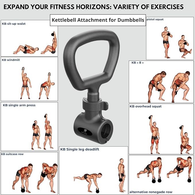 - ⏩ SIMPLE & SECURE ATTACHMENT. Safety and Convenience: Prioritize safety during your workouts with our carefully crafted design. The New patent high-strength modular plastic clamps guarantee a stable connection to your dumbbells during your workout. The simple yet secure attachment mechanism facilitates quick weight changes, promoting a smooth and efficient workout experience. The rotating kettlebell adapter handle ensures a secure grip.