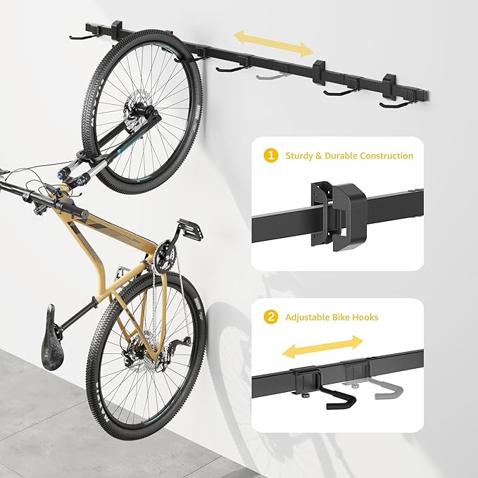 - 【ADAPTABLE TO MOST BIKES】Our adjustable bike racks can be repositioned to fit different bicycle sizes as storage needs evolve. The bike hanger accommodates any bike with a rim width under 3.5 inches, including various types: mountain bikes, road bikes, folding bikes, city bikes, off-road bikes, and bikes for both adults and children. Its wide-sized hooks facilitate easy bike hanging and removal (not suitable for fat tires over 3.5 inches).