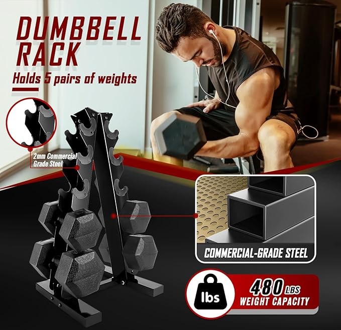 - 【Maximum Weight 480 Pounds】The dumbbell rack stand is utilizes a stable triangular design, ensuring it can support a maximum capacity of 480 LBS. This weight rack provides a secure and sturdy storage solution for your 1-35 pound dumbbells.
