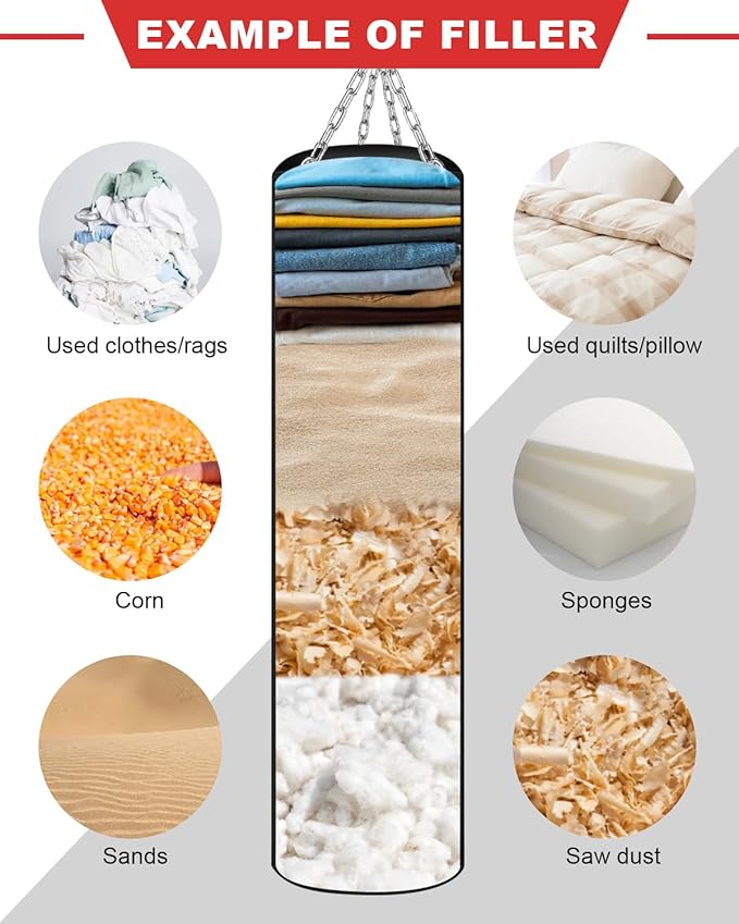 - Easy to Fill: Heavy bag comes unfilled, foldable, easy to carry and store. It can be filled through the zipper seal on the top of the punching bags, you can pack anything you want, such as old clothes, rags, quilts, pillows, sand, corn, sawdust, foam, sponges and cotton, etc, further reducing impact force and providing better protection. Control the weight to suit your preference. But please don't just fill with sands, the fill should preferably not exceed 80 pounds