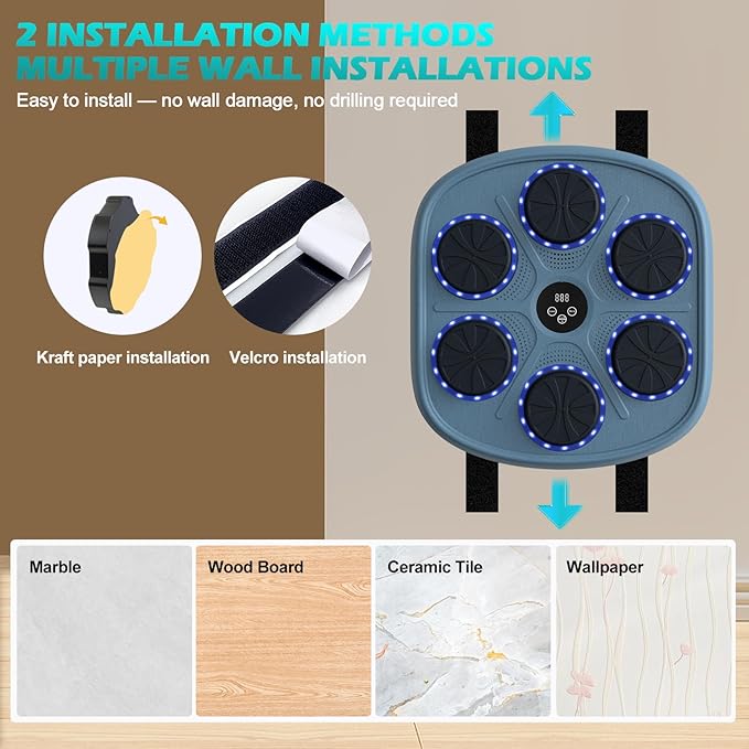 - ✨【Easy Installation】This space-saving smart musical boxing machine is designed for wall-mounted, allowing you to exercise anywhere,space-saving and fits on all types of walls, both indoors and outdoors.No longer need you to go to the gym, you can exercise at home at any time。We recommend using Velcro for installation: this process simply adheres the double-sided Velcro to the boxing equipment and wall. This method is not only secure and easy to adjust, but also safe for children to enjoy.