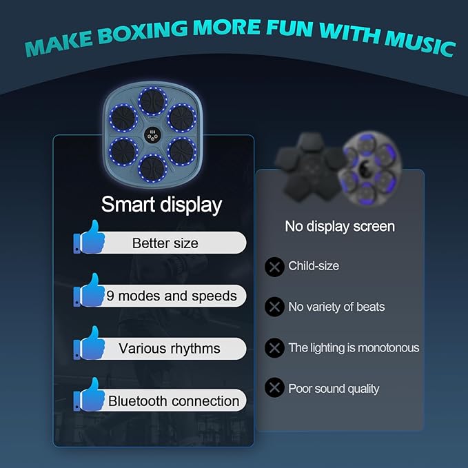 - 🎵【New Upgrade Music Boxing Machine】The upgraded version of the music boxing machine has a wider range of volume adjustment and clearer sound quality; the striking pads are newly upgraded with silicone material, which greatly improves the resilience and softness. The newly upgraded intelligent chip can adjust the sensitivity of the striking pads. The new upgraded music boxing machine can bring you the best sports experience, and at the same time can also bring excellent audio and visual effects.