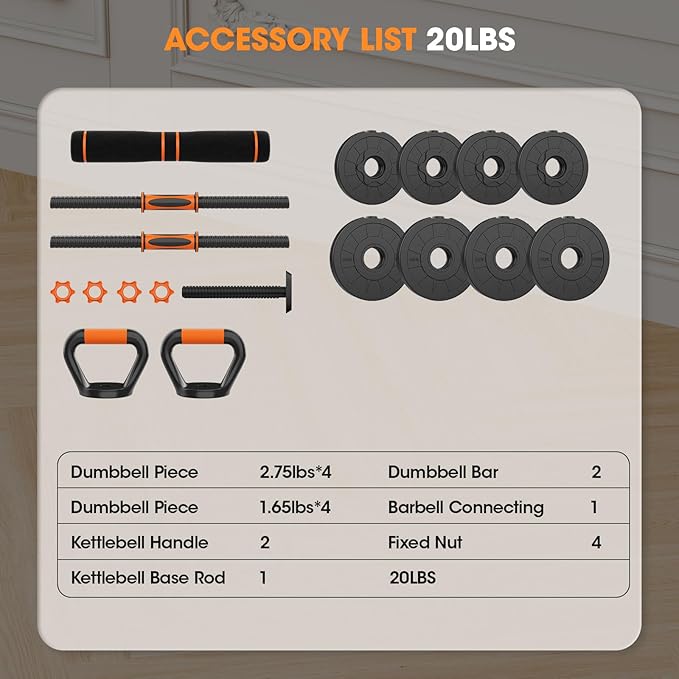 - 【4 in 1 Multifunctional Dumbbell Set】With the adjustable dumbbell set, it can boost your home workout level. Easily transform it into dumbbells, barbells, kettlebells, and push-up bars, switch exercise modes as you like. A 4-in-1 dumbbell set can meet your home gym needs and enjoy multi-faceted fitness
