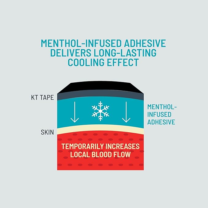 - Dual-Action Pain Relief. This kinesiology tape is infused with cooling menthol for dual-action pain relief. It reduces muscle soreness and helps to alleviate pain from common sports-related injuries such as sprains, strains, and overuse injuries. * Not clinically proven for all injuries*