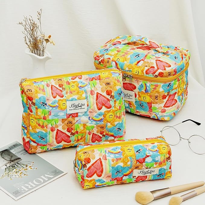 - Makeup Bag Set Product Size --- You will receive a three piece set of cute makeup bag, quilted cotton makeup bag have 3 Size, Big Size:9.8x6.1x5.3in,Medium Size: 9.8x7x2.3in,Small size:7.4x3.1x2.3in, Portable and large capacity.