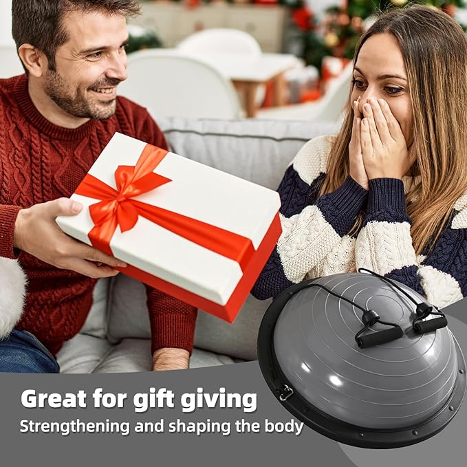 - Dynamic Exercise Options-Position the ball with its flat side down for stability workouts such as squats, lunges, and step-ups. For a more challenging regimen, flip the ball over to engage in push-ups, planks, or burpees. It also includes removable resistance bands that attach to the ball's sides, perfect for strengthening and toning upper body muscles.