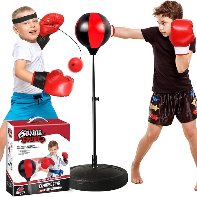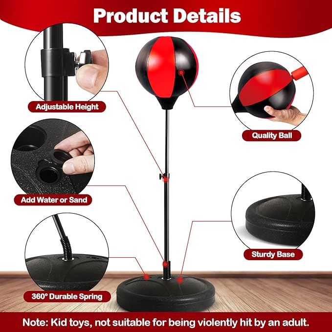 - Our kids punching bag comes with a sturdy base, an inflatable punching ball, 2pack boxing gloves, an adjustable height stand (from 27.5"to 41"), an inflatable pump, boxing reflex ball and install accessories. It can meet he multiple needs for kids