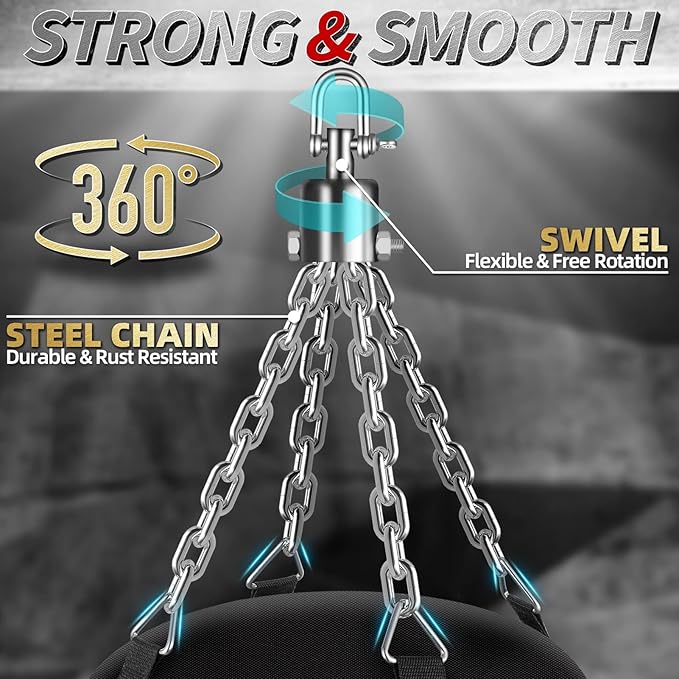 - 【360° Swivel & Sturdy Hanger】The robust 360° swivel enables the heavy punching bag to rotate smoothly and hook hanger offers a powerful 800lbs load-bearing capacity, thoroughly guaranteeing safety and stability during usage