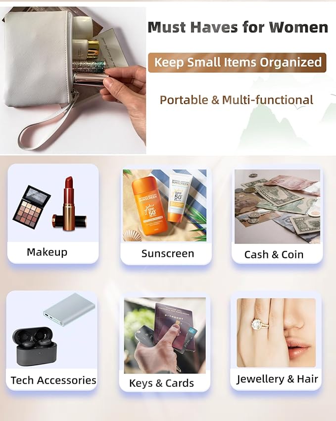 - Versatile Small Pouches for Purse: With a handy wristlet strap, tiny bags is must haves for women as purse pouches for inside purse, small pouch for feminine products, period bag, large coin purse, change holder for car, key pouch, lipstick organizer