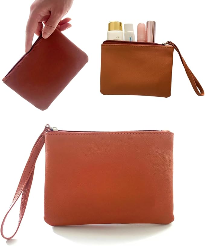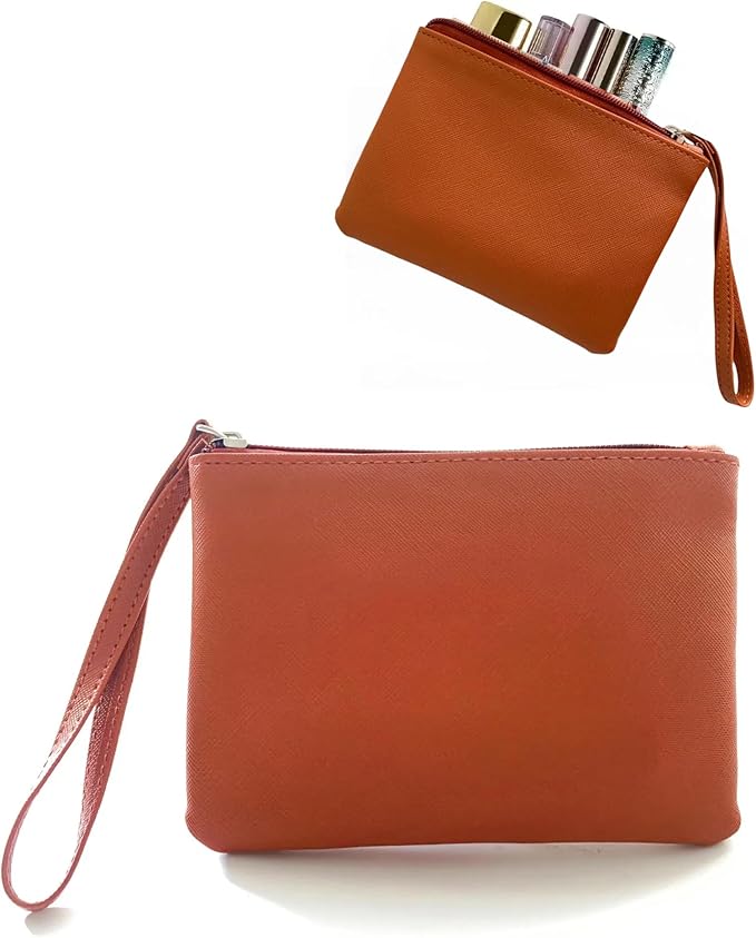 Small Makeup Bag for Purse Mini Cosmetic Pouch Zipper Little Wristlet, Tiny Make Up Organizer Lipstick Feminine Product Car Change Coin Holder for Women, 4.5 x 6.5 Clutch Stadium Approved, 1 Brown