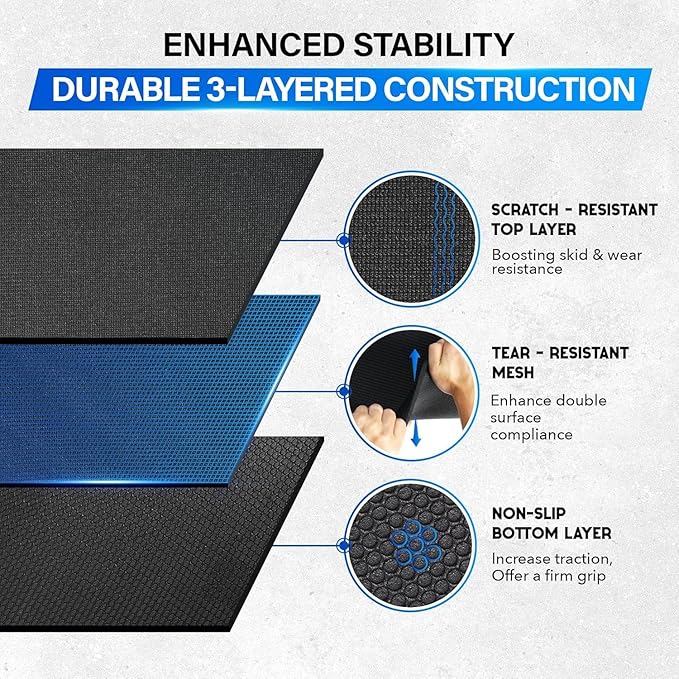 - DOUBLE-SIDE NON-SLIP SURFACE: Weight mat is equipped with double non-slip layers; Unique bumpy non-skid texture on surface and underside make garage workout mat stays in place during workout, increases traction, offers a firm connection to the floor