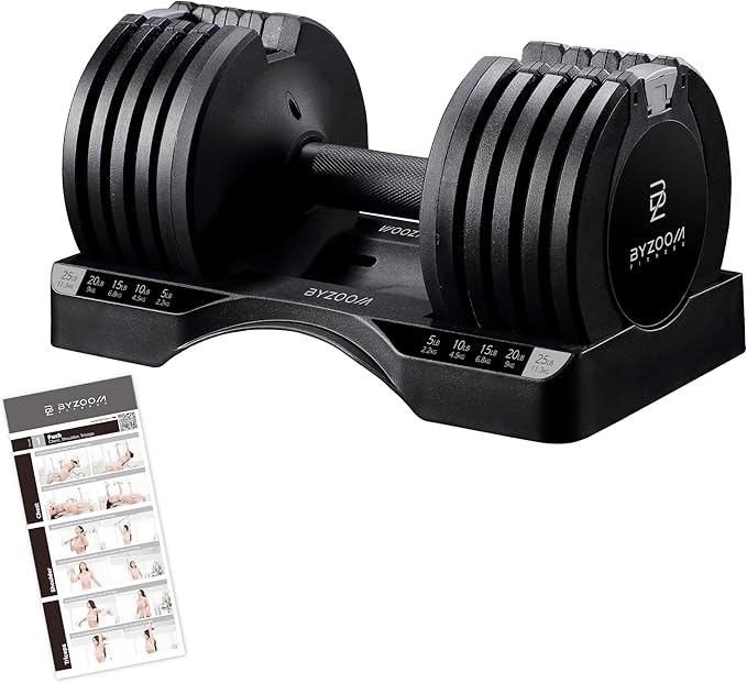 - CONVENIENT AND SPACE SAVING: Fixed length on adjustable dumbbells is never a problem for BYZOOM FITNESS. The exclusive patented weight selection mechanism allows you to have an accurate weight and adjustable length.