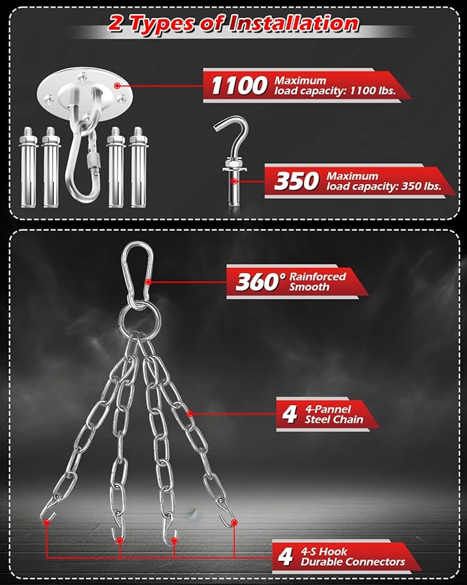 - Heavy Duty Hanger Accessories Set: Punching bag chain is made of stainless steel, permanent rust-proof, safety, environmental protection, very suitable for hanging heavy bags. The round hanging hanger is installed with 4 expansion bolts, is very strong and safe, and can bear up to 1100 lbs! Hang up boxing bag and start you boxing training
