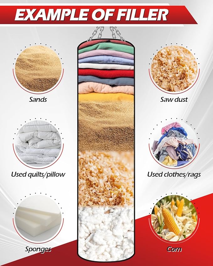 - Please Note: This punching bag for adults is unfilled. You can use sawdust, sand, old clothes, sponge, quilt, shredded cotton fabric, soybean, corn, cotton and other fillers. But please do not only fill sand, filling preferably not more than 50 pounds