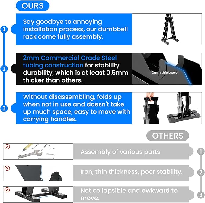 - Our heavy duty steel dumbbell rack is made of 2mm commercial grade steel tubing construction for stability durability, which is at least 0.5mm thicker than others. Plus the dumbbell holder has a top carrying handle to move it around & folds up easily without disassembling to cleaning or different locations at home.