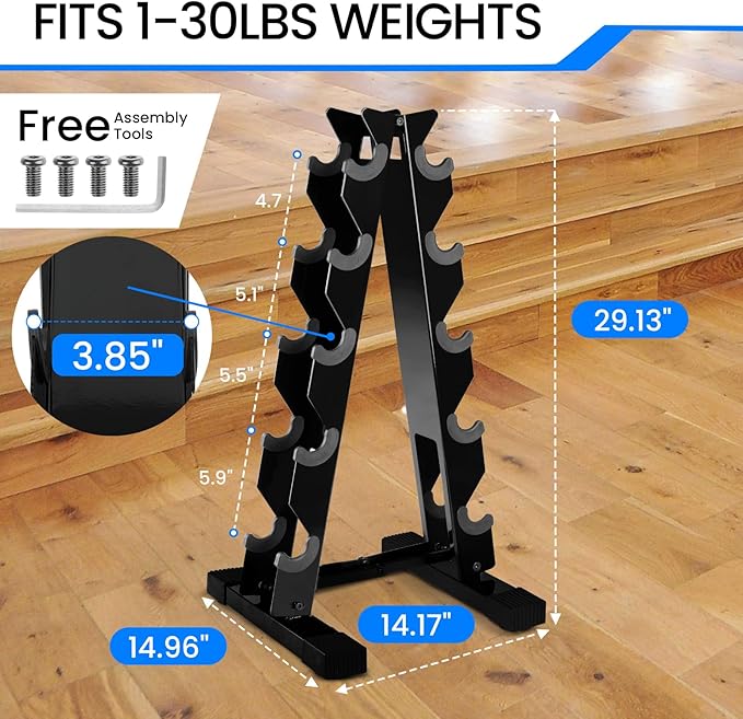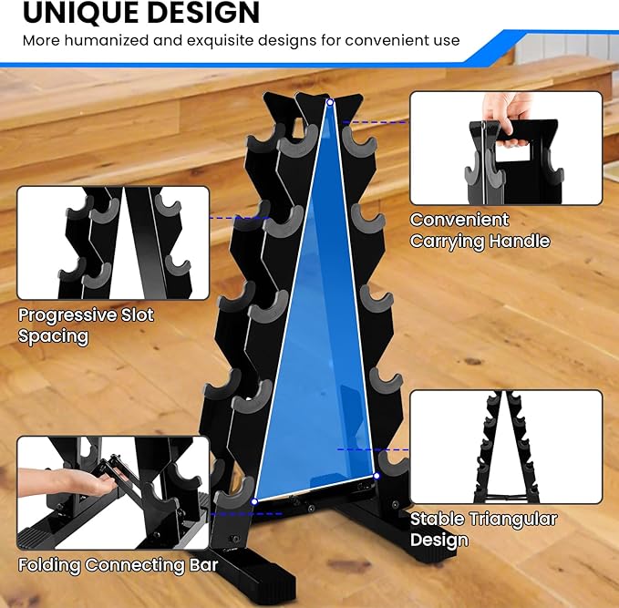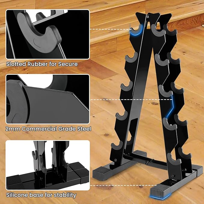 - The A-frame dumbbell rack with a progressive slot spacing and uses a stable triangular design, dumbbell stands is suitable for 5-35 pound dumbbells, such as neoprene dumbbells, hex dumbbells, etc. A-frame rack can hold up to 260 pounds without feeling like it’s about to fall apart or anything.